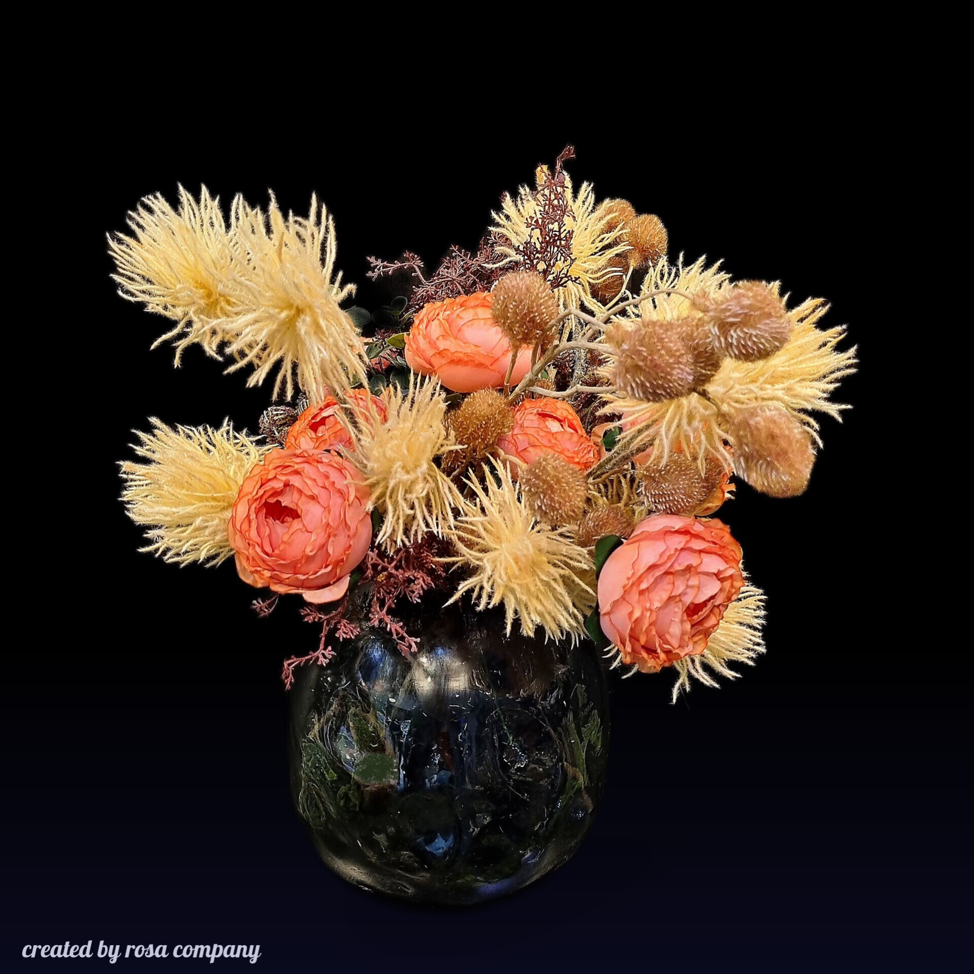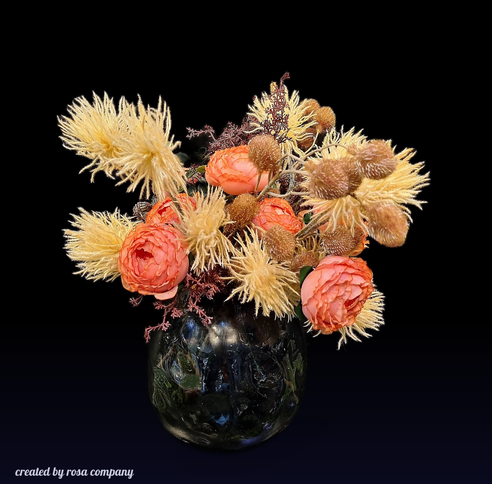 «رزهای شعله‌ور» ترکیبی از رزهای نارنجی و زرد با گل‌های خار طلایی است که در گلدانی تیره رنگ قرار گرفته‌اند. طراحی آن یادآور انرژی و شور زندگی است.