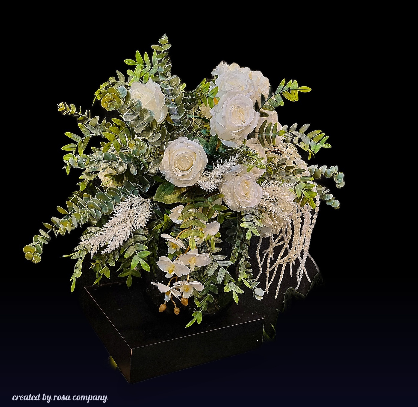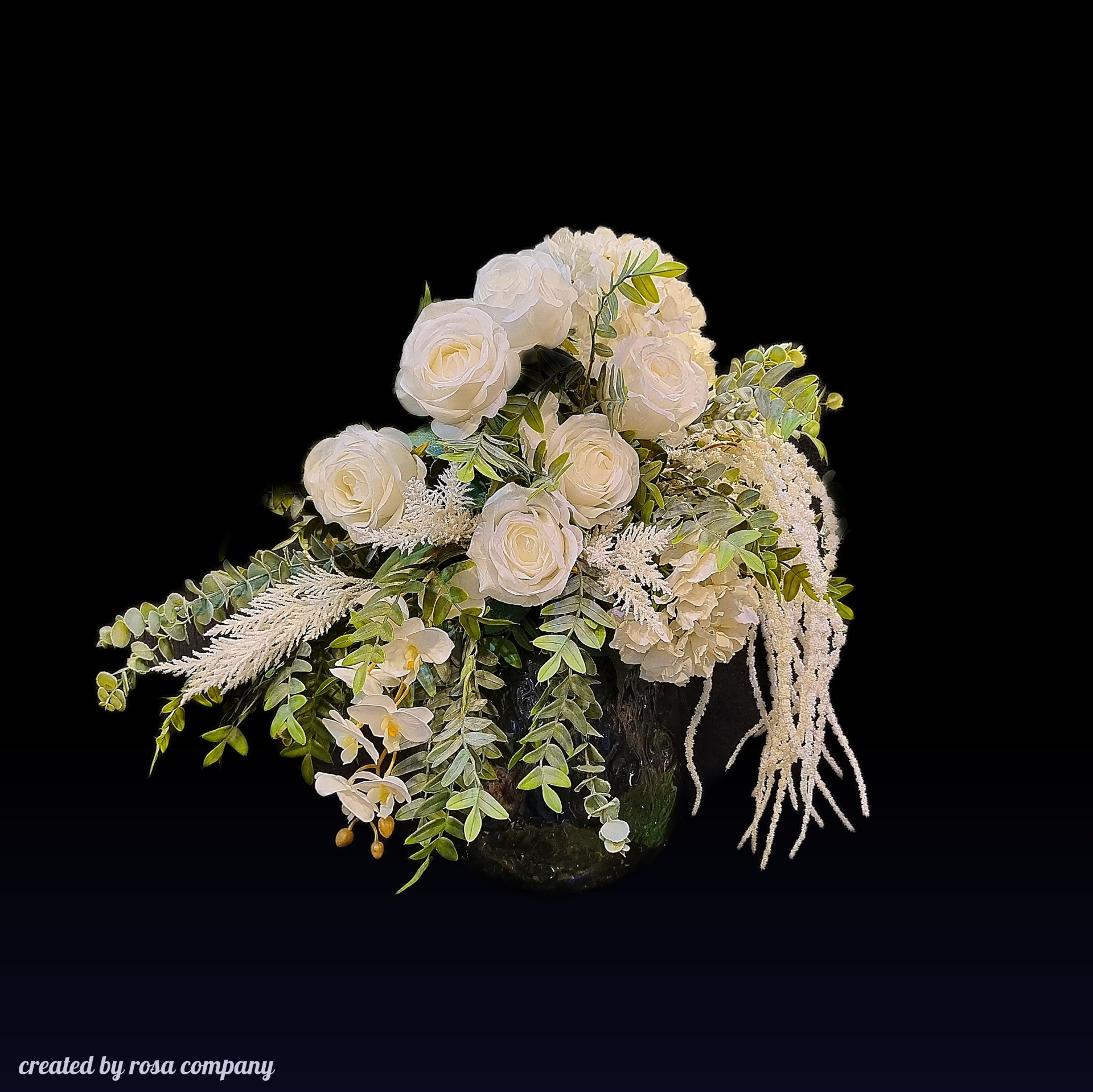 «سفید برفی» با گل‌های رز سفید و برگ‌های سبز، فضایی آرام و مینیمال به محیط شما می‌بخشد. طراحی آن در گلدان مکعبی مشکی جلوه‌ای مدرن و خاص ایجاد کرده است.